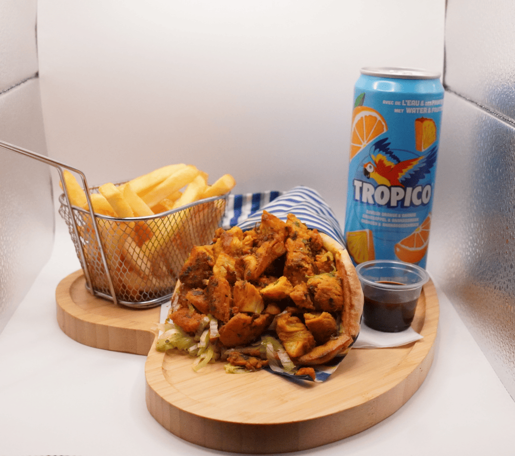 Savourez un cheese naan moelleux garni de poulet au curry parfumé, accompagné de salade croquante, de tomates juteuses et d’oignons frais. Un mélange généreux et gourmand qui allie douceur, épices et fraîcheur.